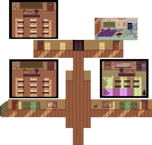 Sau khi trở về từ Thế giới hắc ám ở Chương 1, Kris và Susie thấy mình đang ở trong một phòng học không sử dụng. Nó được rải rác với các thẻ chơi, đồ chơi và trò chơi, sự sắp xếp của chúng, bắt đầu từ một cánh cửa bị khóa ở bên trái, tương ứng với con đường của cuộc phiêu lưu của cả nhóm trong hắc ám. Ở phía sau lớp học có một con thú nhồi bông có bề ngoài gần giống Seam, và trên tủ có bức vẽ Gerson Boom do con trai ông ấy vẽ Alvin. Phòng học không sử dụng nằm ở góc đông bắc của trường, và một căn phòng khóa khác nằm dưới hành lang ở góc tây bắc.