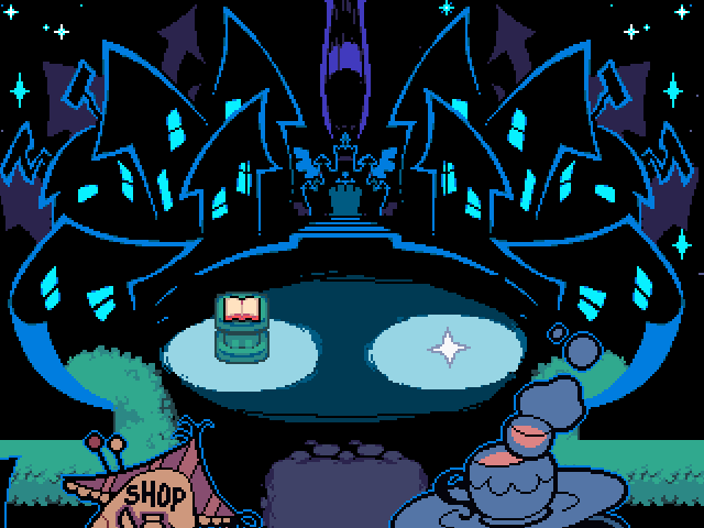 - After Kris returns, if Susie's dialogue is still present when she says "... one...?", the Darkners' sparkles overlap the dialogue box.