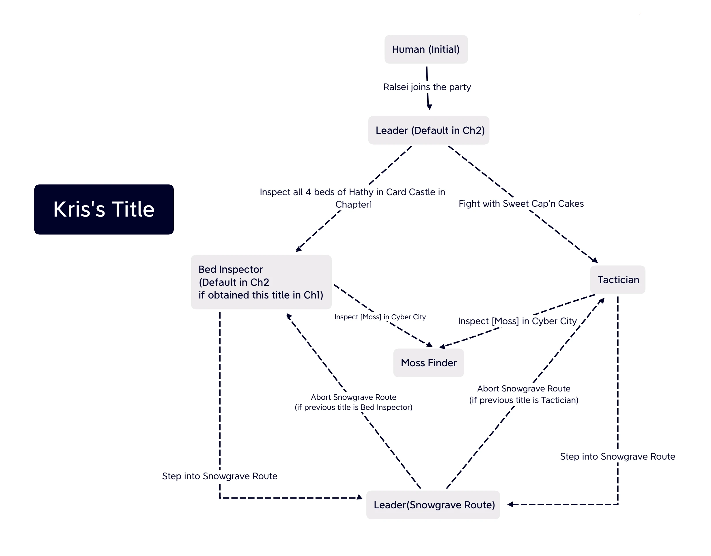 | 领队 | 用各种行动(ACT)指挥小队. | Ralsei 加入小队后。 第二章开始时的默认头衔。 |