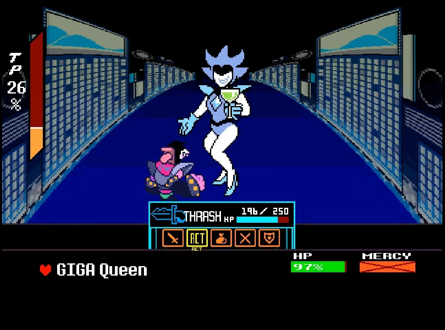 在与GIGA Queen的战斗中,己方揍人机器的HP会由之前招纳的敌人与NPC数目人数决定,招纳的角色越多,总HP会越高,最高为250HP。这场战斗中回复HP的方式有两种:自我修复与鸭子模式(要求第一章设计的揍人机器是鸭子头)。前者消耗一定量的TP回复100HP,使用次数越多消耗的TP也会越多;后者消耗50%TP立即进行一次吸血攻击,并且在下一个回合内每次按Z/X键攻击到Queen后都会回复2点HP。