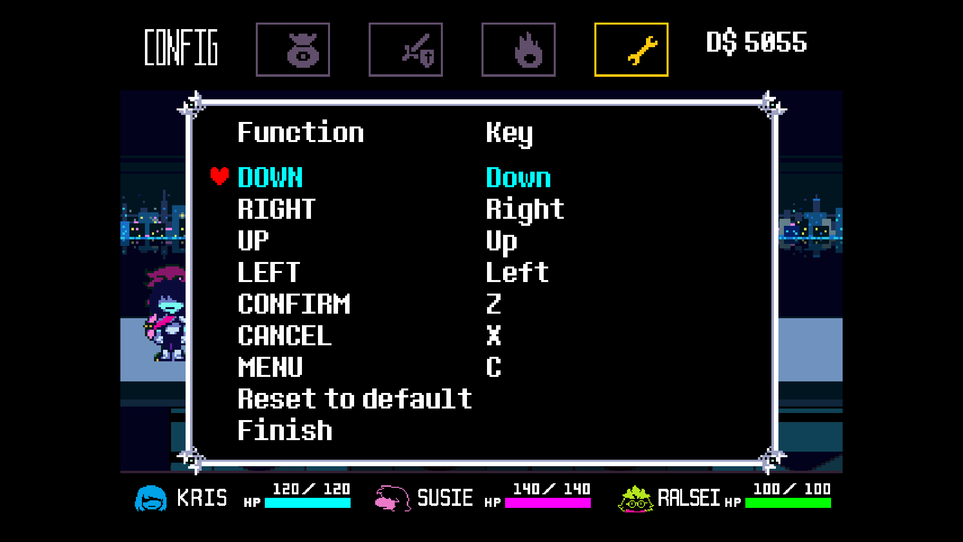 设置(Config)菜单可以在黑暗世界菜单中找到,它位于最右侧,以一个扳手的图标显示,并且能用来改变一些设置。