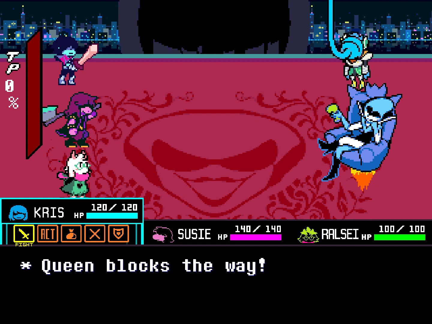 小队与Berdly交流完之后继续前进,这时Queen会再次出现。此时,她会介绍骑士的到来和喷泉的诞生,并且指出,如果一个光之民有足够的决心,便能将自己的意志凝聚在自己的武器上面,创造一个新的喷泉,而既然当下骑士离开了,她只需要找一个新的骑士。接着,她和在后面被束缚在大手上的Noelle交流,试图让她造一个新的喷泉,结果话没说完就被Susie击飞了。被救下的Noelle警告小队赶紧逃跑,此时Queen启动了她的巨型機器人,嘲讽小队之前在她的宅邸里面甚至没注意到她的巨型機器人。Noelle对此很害怕,因为Queen曾经对Noelle吹嘘过这个機器人是Queen的终极形态,而且是无敌的。此时Susie还想反抗,结果所有人被Queen的一酒杯的酸性液体所击倒,然后Queen要让所有人看着她主宰整个世界。尽管Noelle劝Susie尽快放弃,但是Susie并不死心,要求Kris和Ralsei和她一起组成他们的"终极形态"。这个形态其实就是与Queen第一次进行街机游戏机的战斗时小队组成的形态,Queen于是表示他们竟然势均力敌了,既然如此她就会全力反击了,然后一拳打到楼顶上,把小队给震飞到落下了。